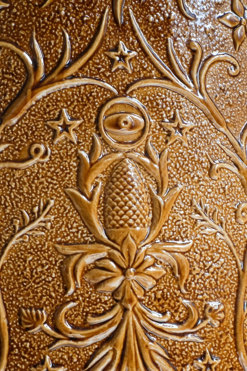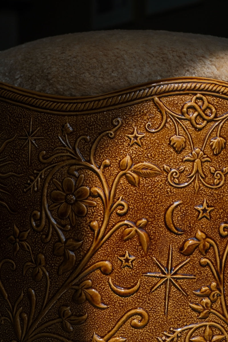 Sur son fût, une fresque gravée émerge : fleurs alchimiques, soleils flamboyants, étoiles et volutes végétales dansent dans un entrelacs sacré. Chaque symbole fait écho à un arcane : la main du Pape, l’Étoile, le Soleil, l’As de Coupe… Le relief, à la manière du cuir repoussé, capte la lumière et révèle un monde secret qui se dévoile aux initiés.