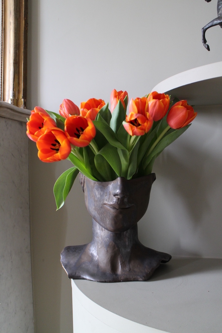 Le vase Tête de Bronze, créé par Thalia Dalecky, est une fusion de force et de délicatesse. Réalisé en grès orange avec un visage sculpté en haut-relief dans un grès émaillé noir métallisé, il capte la lumière pour révéler des reflets dorés sur ses contours, comme un écho du bronze ancien.